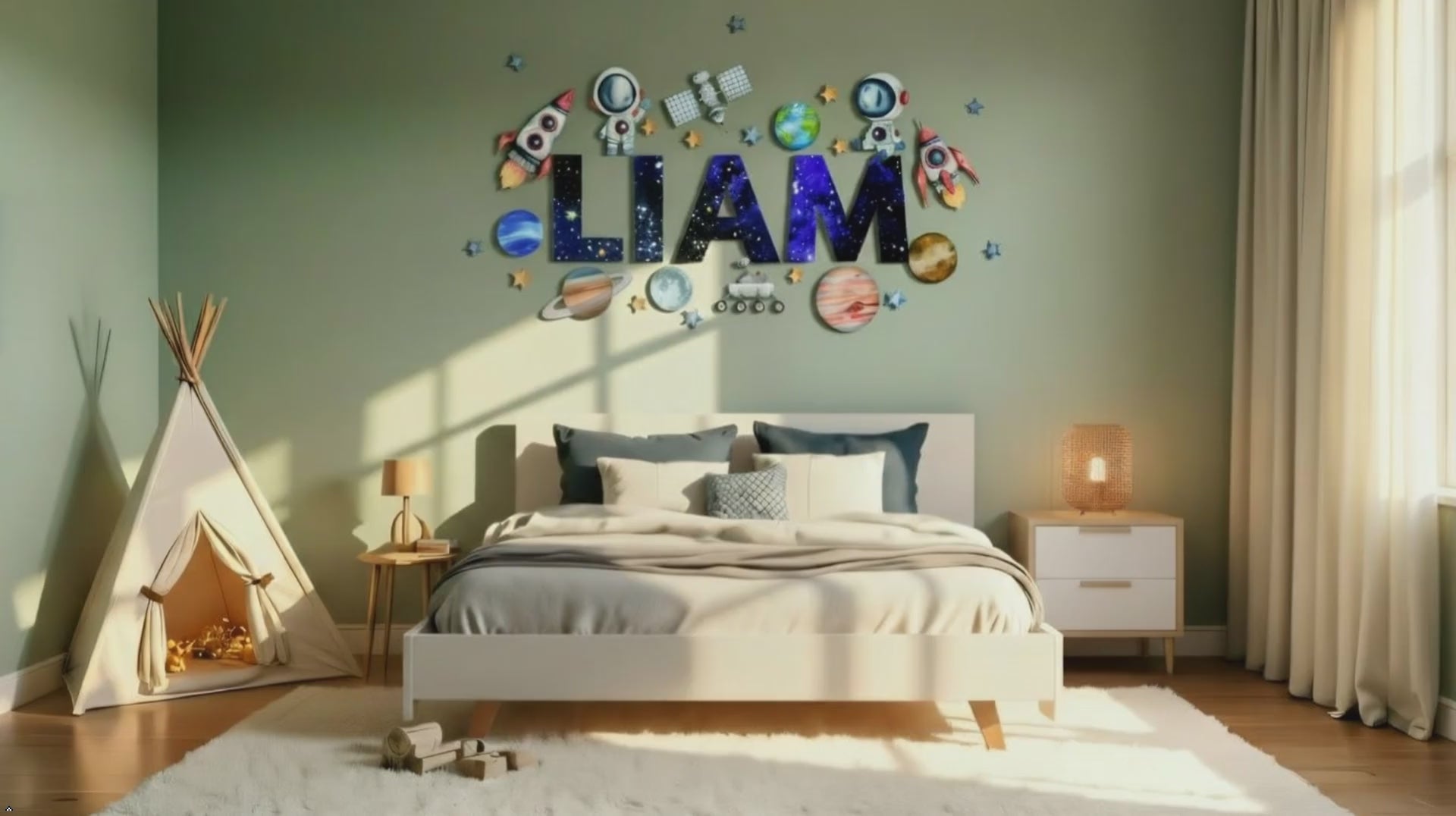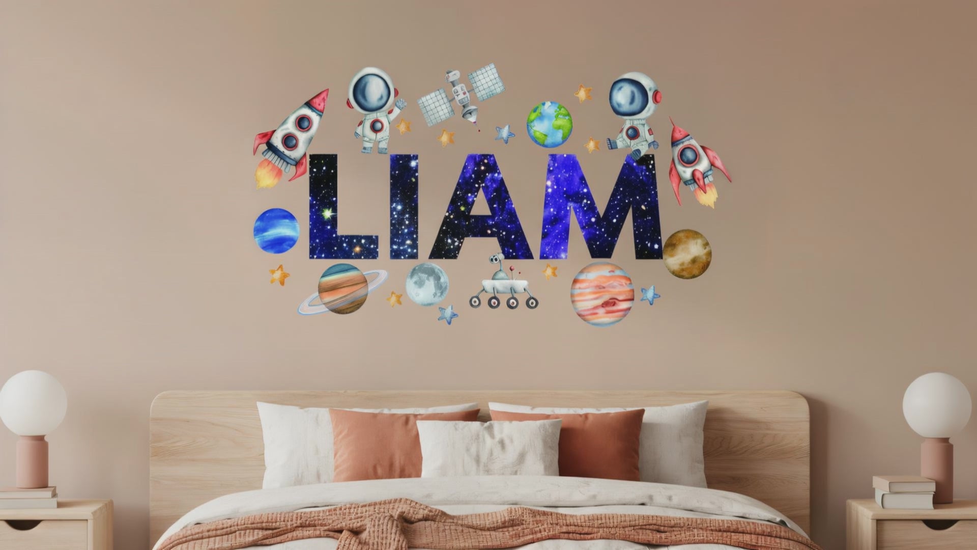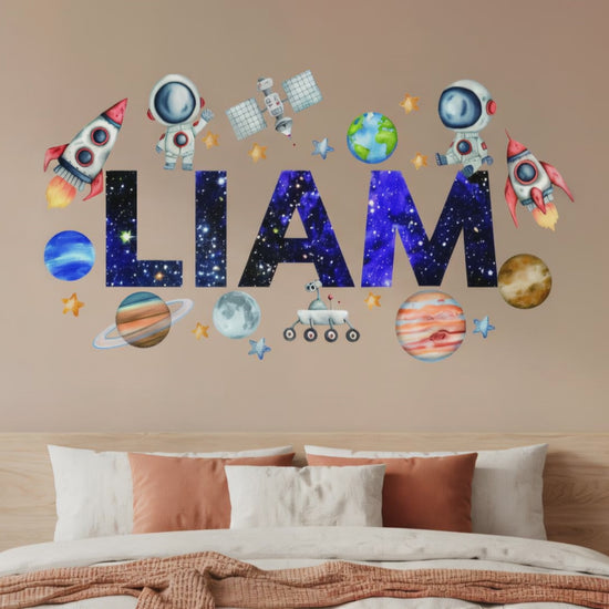 Add your child's name to create a one-of-a-kind space-themed room. Featuring colorful rockets, planets, and stars wall decals, this decal sparks creativity and makes their room feel special. Perfect boys nursery wall art. -